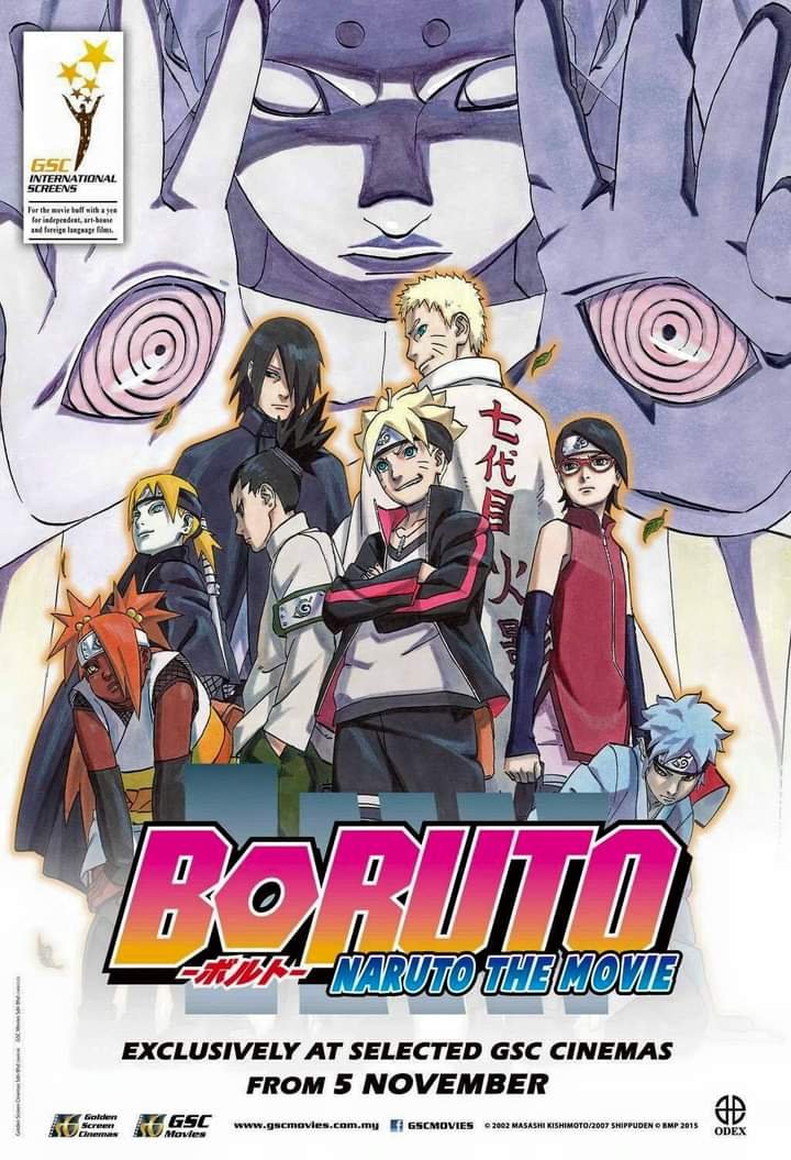 Filem animasi terbaru Naruto ini mengisahkan tentang Boruto Uzumaki yang merupakan anak kepada Naruto Uzumaki, generasi ke-7 Hokage dari Hidden Leaf Village. Selepas mendengar cerita mengenai tindakan hero Naruto, Boruto bercita-cita untuk mengatasi bapanya. Boruto kemudian bertemu dengan rakan bapanya, Sasuke Uchiha, dan meminta agar melatihnya untuk menyertai peperiksaan Chunin bersama-sama Sarada Uchiha dan Mitsuki. Filem telah mula ditayangkan di seluruh pawagam yang terpilih mulai 5 November 2015. Lawati Facebook www.facebook.com/gscmovies untuk senarai pawagam yang menayangkan filem ini.