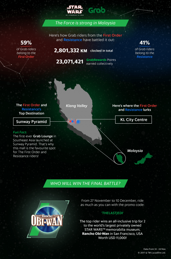 The Force has been strong in Malaysia over the past few weeks since the launch of the #MasterYourForce with Grab campaign. 59% of Grab riders in Malaysia have pledged their allegiance to The First Order, whilst only 41% chose to fight for The Resistance.