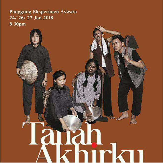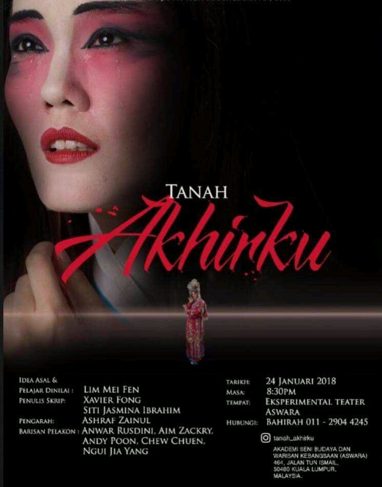 Pada 24, 26 dan 27 Januari 2018 ini, sebuah produksi anak-anak seni ASWARA iaitu teater yang bertajuk TANAH AKHIRKU akan dipentaskan di Panggung Eksperimen, Aswara, jam 8.30 malam. Lakonan utama pelakon muda berbakat besar Mei Fen Lim dan Anwar Rusdini, berdasarkan idea asal Mei Fen Lim sendiri dan skrip pentas digarap oleh Xavier Fong dan Siti Jasmina Ibrahim, diarahkan oleh pengarah muda Ashraf Zainul.