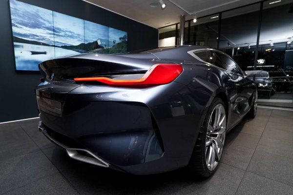 The slim, stretched-out rear lights extend far into the sides of the BMW Concept 8 Series and provide a connection between the rear and flanks. The lights themselves take the form of L-shaped blades and project out from the rear. They emphasise the width of the car and its muscular stance on the road, and their slender form gives the rear an ultra-sporty and modern flavour. The dark, stylised carbon-fibre diffuser in the lower section of the rear apron adds extra lightness and a sportier feel to the rear graphic. Large, trapezoidal exhaust tailpipes frame the rear section and point to the dynamic driving experience to come.