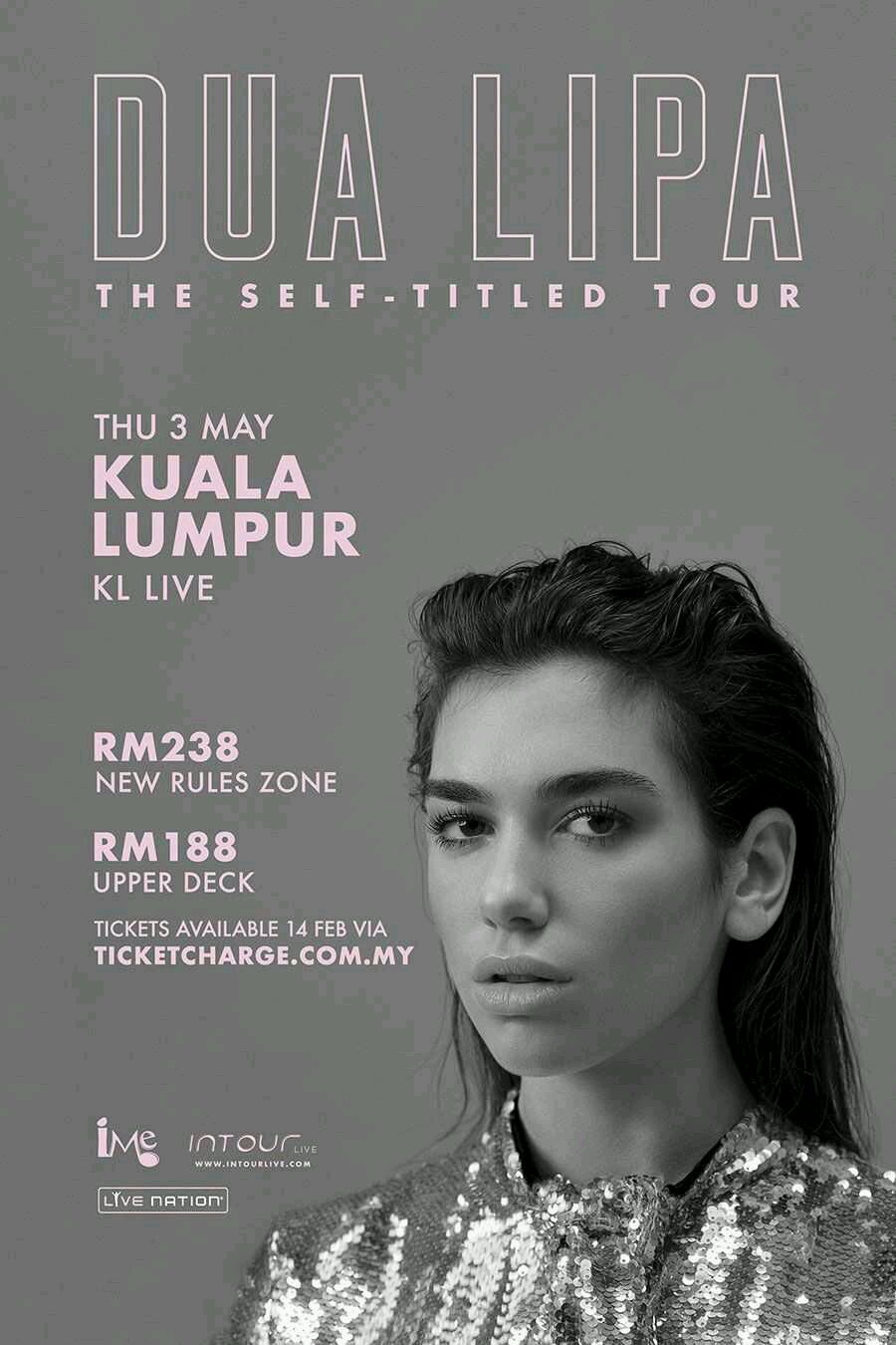 Peminat Dua Lipa boleh bergembira kerana penyanyi ini akan kembali ke Kuala Lumpur pada 3 Mei 2018 untuk pertunjukan solo pertamanya di KL Live sebagai sebahagian daripada ‘The Self-Titled Tour’. Pintu akan dibuka pada pukul 7.30 malam, dan pertunjukan akan bermula pada pukul 8.30 malam.