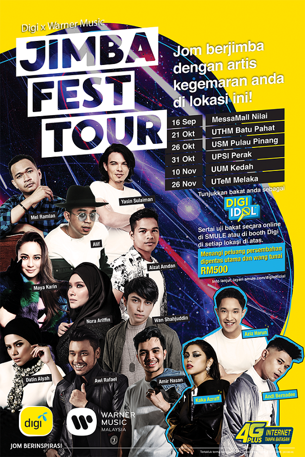 SUBANG JAYA, 17 Oktober 2018 –Digi Telecommunications Sdn Bhd (“Digi”) dan Warner Music menjemput semua belia Malaysia untuk menyertai acara Jimba Fest Tour, dipenuhi dengan keseronokan dan muzik, yang akan diadakan di lima lagi lokasi dari 21 Oktober sehingga 26 November di seluruh negara.
