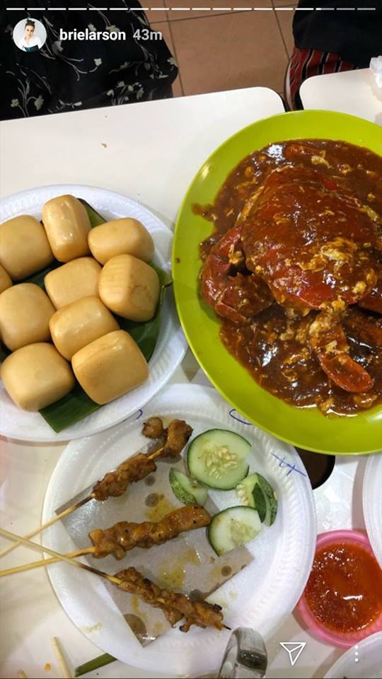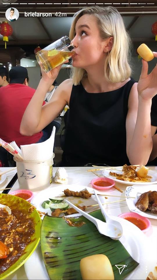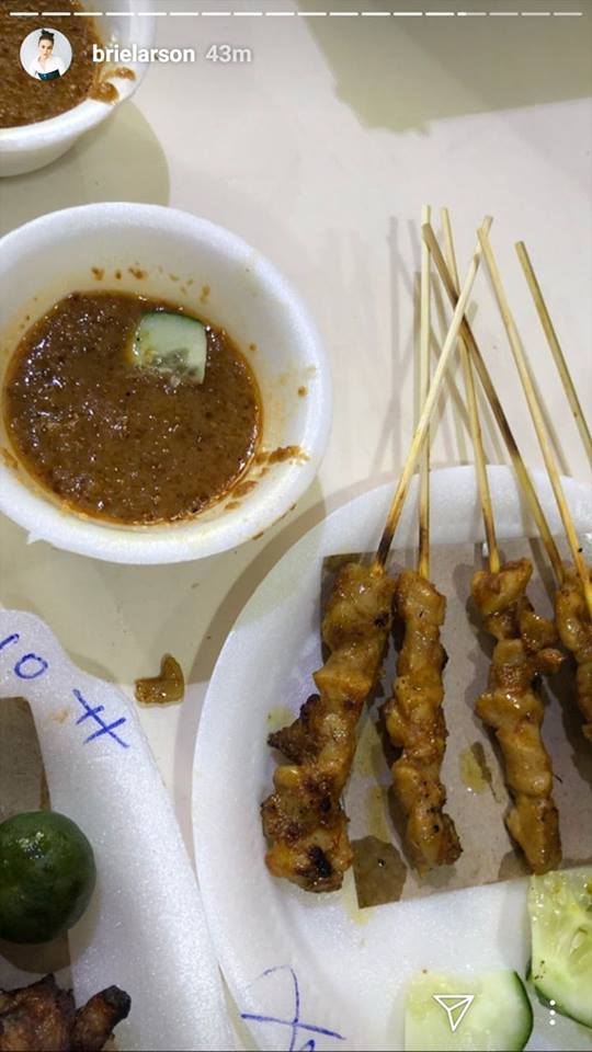 Pelakon Brie Larson telah berkongsi foto beliau menikmati sate di Instagramya di mana ketika ini beliau berkunjung ke Singapura dalam rangka promosi filem Captain Marvel lakonannya terbitan Marvel Studios yang bakal menemui para penonton bulan Mac ini. Turut bersamanya ialah Gemma Chan (Crazy Rich Asians) yang membawakan watak Minn-Erva.
