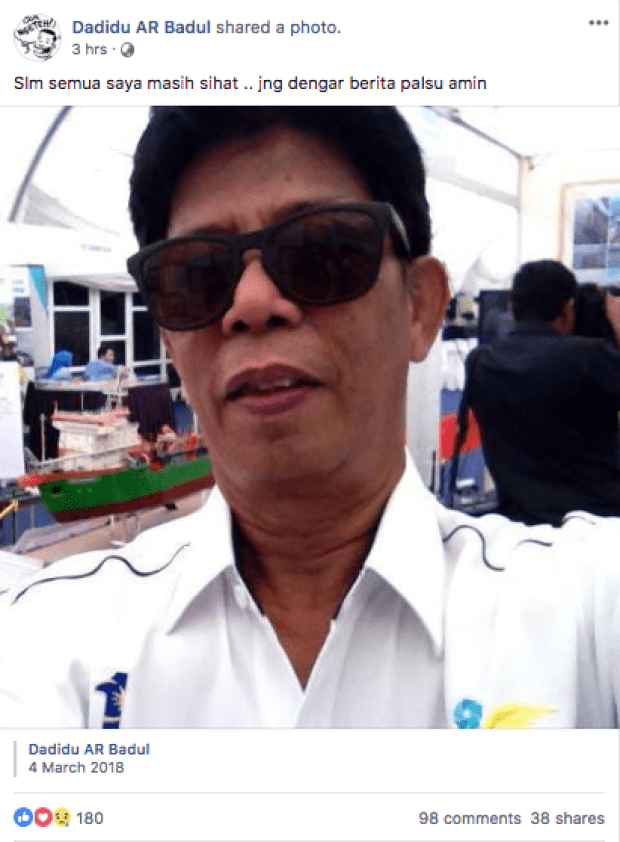“Salam semua saya masih sihat .. jangan dengar berita palsu amin”, begitulah status ringkas yang dikongsikan di laman profil Facebook AR Badul selepas tersebar berita palsu tentang kematiannya di laman-laman Facebook blog nyamuk.