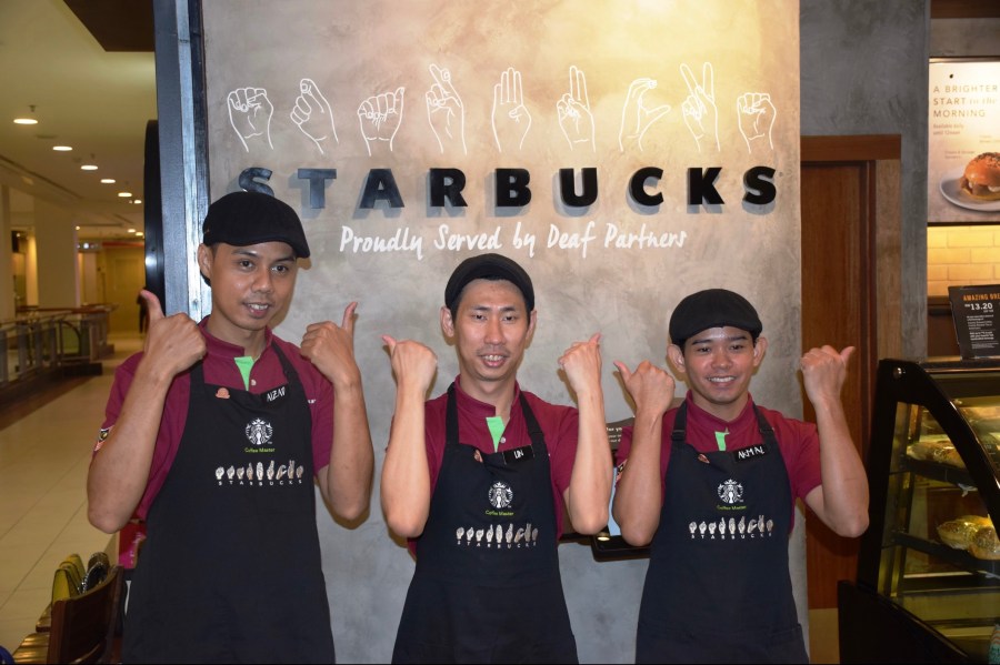 Given an equal opportunity as any Starbucks barista, the Signing Store partners have proved their confidence in working and handling a variety of brewing equipment professionally. This has further raised awareness about the Deaf culture at the workplace to surrounding communities. The Deaf baristas are making more than just a cup of coffee but also sharing the warm approach of Starbucks through their perspective. The Deaf Coffee Masters in Malaysia are distinguishable by their black aprons that feature a special embroidery with ‘Starbucks’ in Malaysian Sign Language.