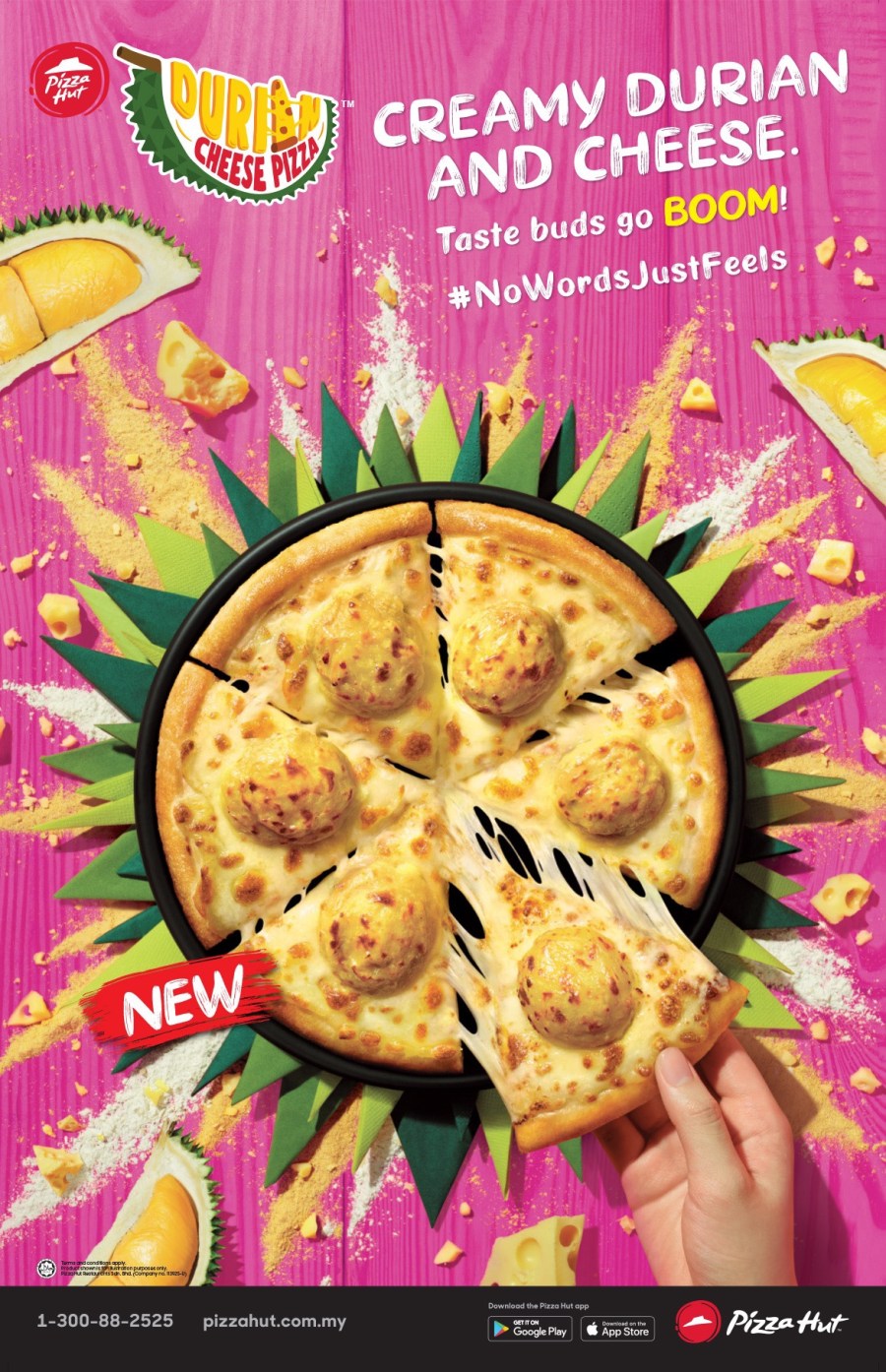 KUALA LUMPUR, 9 Ogos 2019 – Pizza Hut Malaysia membawakan kejutan hebat kepada para peminatnya apabila memperkenalkan ciptaan yang menggabungkan kelazatan rasa keju dan keenakan ‘raja buah’ menerusi Durian Cheese Pizza terbaharunya. Ciptaan istimewa ini bakal mencetuskan fenomena yang tersendiri, bermula hari ini hingga 30 September 2019 di semua rangkaian restoran Pizza Hut dan konsep penghantaran seluruh negara sehingga stok masih ada, memberikan peluang kepada peminat untuk mengalami penyatuan gastronomi paling unik di abad ini!