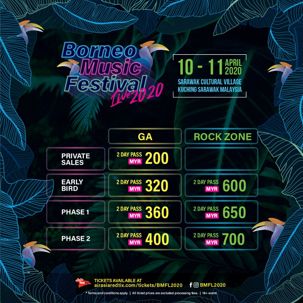 Tickets to Borneo Music Festival Live 2020 will go on sale on 14 January 2020 from 12:00 noon through airasiaredtix.com/tickets/BMFL2020 with ticket prices as follows: