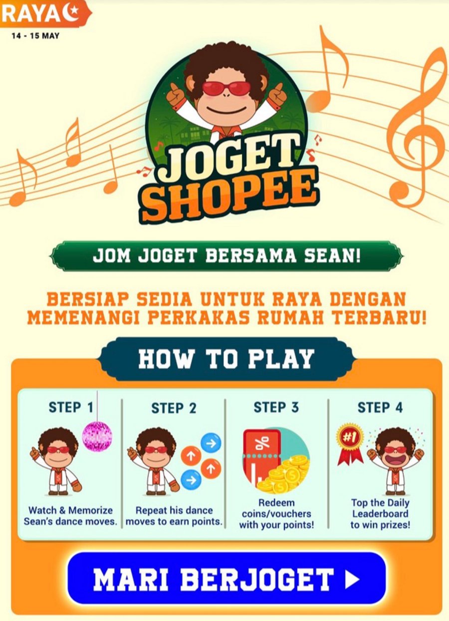 • Shopee Games: Hafal pergerakan tarian di Joget Shopee; tangkap kuih-muih di Shopee Tangkap dan berseronok dengan permainan kegemaran ramai Goyang Shopee, Shopee Throw, Lucky Raya dan One or Not untuk memenangi syiling Shopee, baucar dan juga televisyen 43 inci.