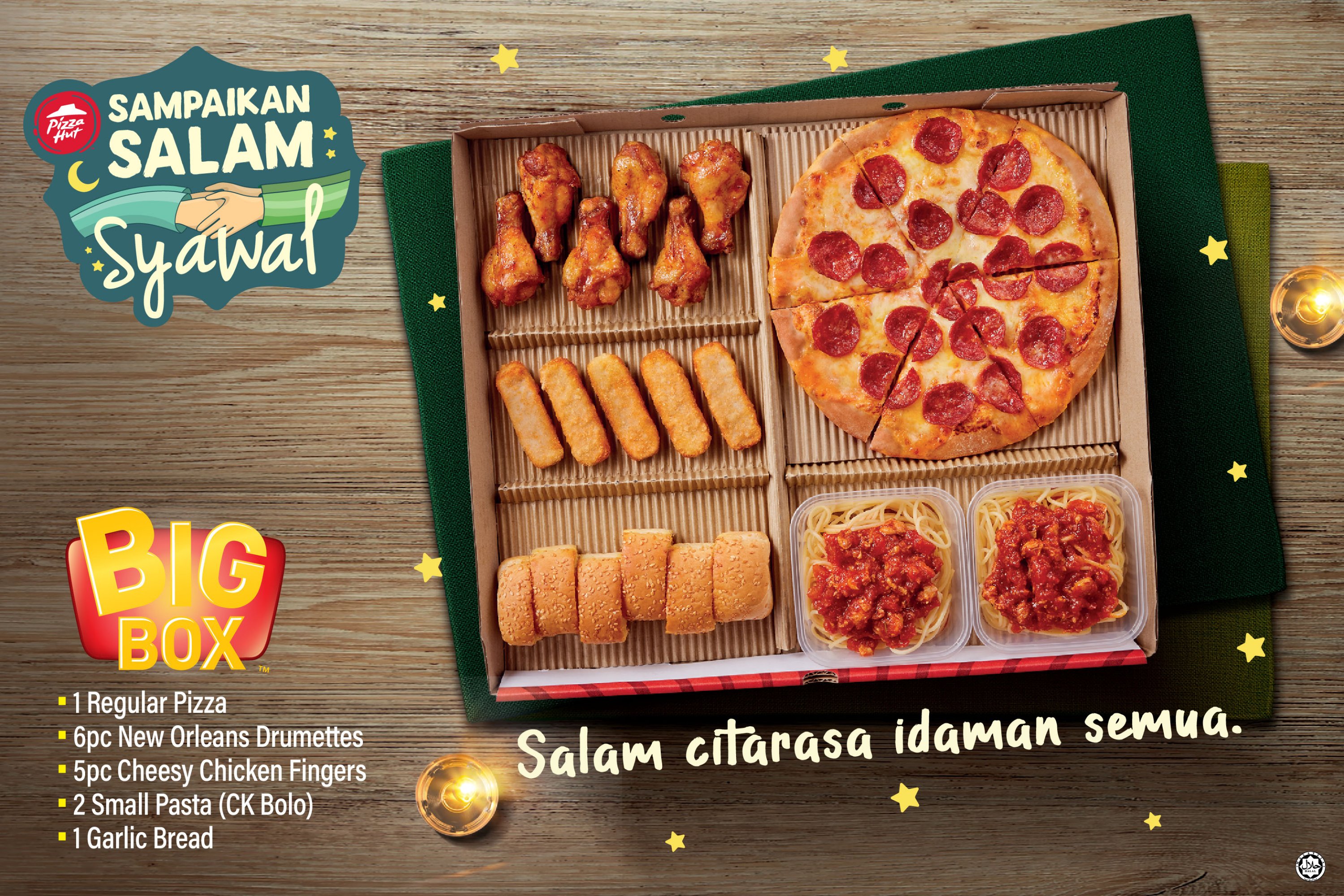 Meriahkan lagi juadah Raya anda dengan hidangan besar Big Box, Big Box Plus, Double Box, On the Go 4, dan My Box bermula dari RM16.90, dan juga diskaun 50% untuk pizza saiz biasa melalui promo ini. Kotak Pizza Hut kali ini menampilkan hiasan bertema Raya khas untuk suasana perayaan apabila mereka membeli set Big Box, Big Box Plus dan Regular Double Box.