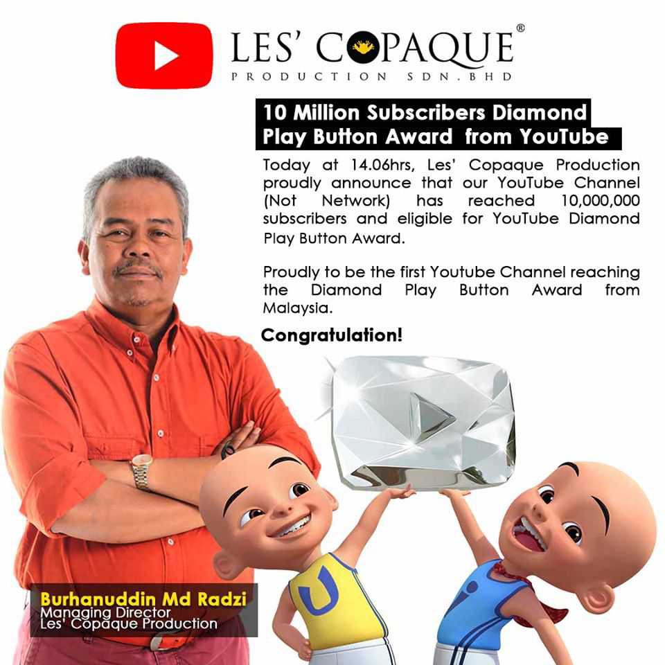 Dengan pencapaian ini Les’ Copaque Production layak menerima anugerah “Diamond Play Button” dari YouTube. Anugerah ini hanya diberikan kepada saluran yang berjaya mencecah 10 juta pelanggan. Les’ Copaque Production sebelum ini telah menerima anugerah “Silver Play Button” untuk 100, 000 pelanggan dan “Gold Play Button” untuk 1 juta pelanggan. Sehingga Februari 2020, hanya 566 Saluran YouTube di seluruh dunia yang telah mencapai 10 juta pelanggan.