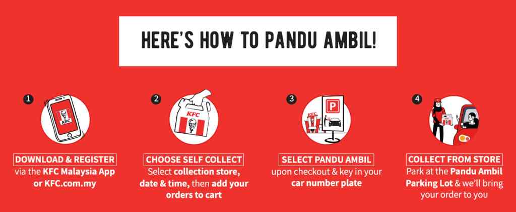 Pandu Ambil dan staf KFC akan membawa pesanan kepada anda. Jadi, jika anda idamkan sajian KFC kegemaran anda, cubalah perkhidmatan Pandu Ambil terbaharu dari KFC. Ianya mudah, selamat, dan tanpa sentuh, dan seperti slogan Pandu Ambil – Tapau macam Boss!