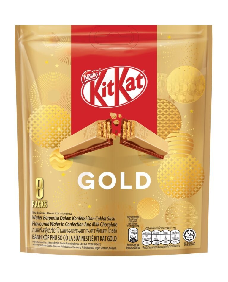 KITKAT Gold merupakan kombinasi dwi lapis coklat bermutu tinggi dan lazat, dengan bahagian atasnya bersalut warna kuningan emas yang memukau dan coklat susu halus di bawahnya, membaluti lapisan wafer rangup tandatangan berperisa pralin mentega dan kacang di dalamnya. Ia dibungkus dengan pek emas menyarau sebagai tanda tuah dan kekayaan. Pembungkusan untuk edisi terhad kali ini adalah direka bentuk secara uniknya dengan menerapkan elemen-elemen sambutan perayaan seperti buih dan kilau-kilauan, selain digunakan juga pembalut berwarna emas. Ia cukup sesuai untuk diberi sebagai hadiah ataupun dikongsi bersama sahabat-handai dan orang yang tersayang.