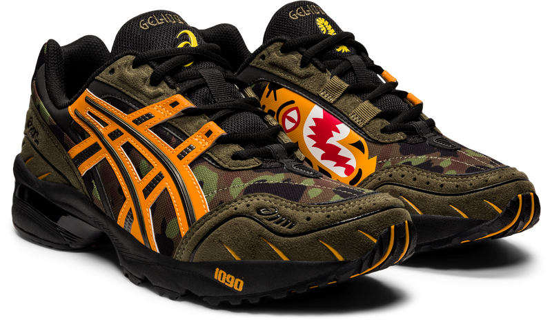 The shoe’s medial panels are offset with the BAPE® shark icon, synonymous with the designs painted on the nose of fighter jets. Additionally, the ASICS Spiral logo on the tongue and heel have been converted into a tiger caricature as a nod to one of BAPE®’s historic logos.