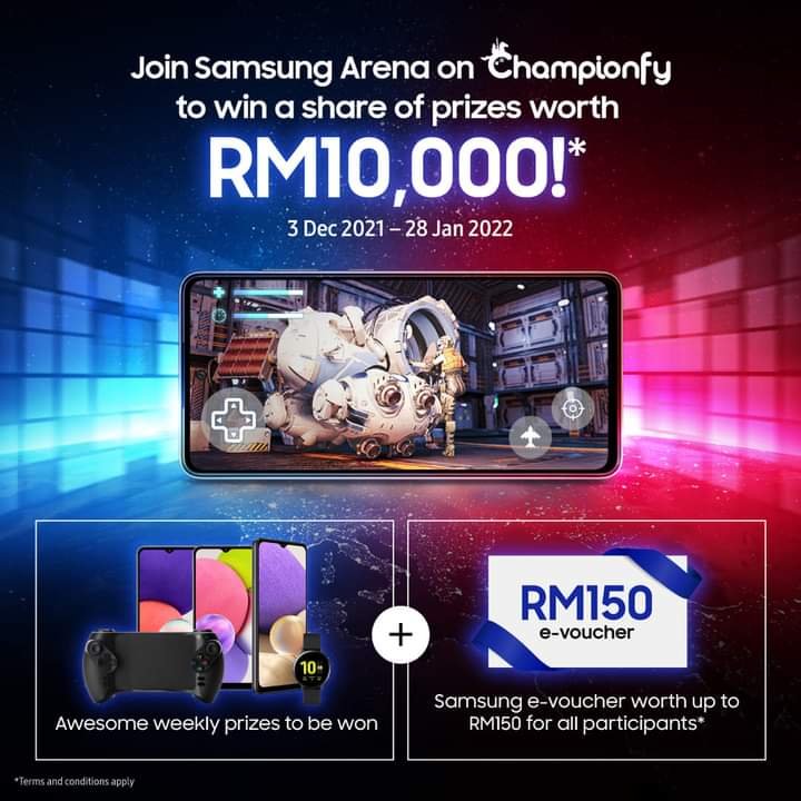 Gemar menghabiskan masa lapang anda dengan bermain permainan video yang menyeronokkan? Ia bakal menjadi lebih seronok bagi anda kerana minggu ini, Samsung mengumumkan kolaborasi mereka bersama platform Esports terkemuka, Championfy. Para pemain akan berpeluang untuk memenangi e-baucar bernilai sehingga RM150 berserta hadiah mingguan apabila mereka menyertai pertandingan di Samsung Arena dari 3 Disember 2021 hingga 28 Januari 2022.