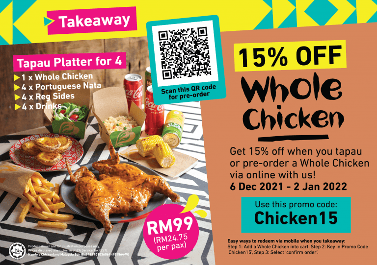 Get 15% off when you takeaway or pre-order a Whole Chicken via online by using the promocode “Chicken15”.