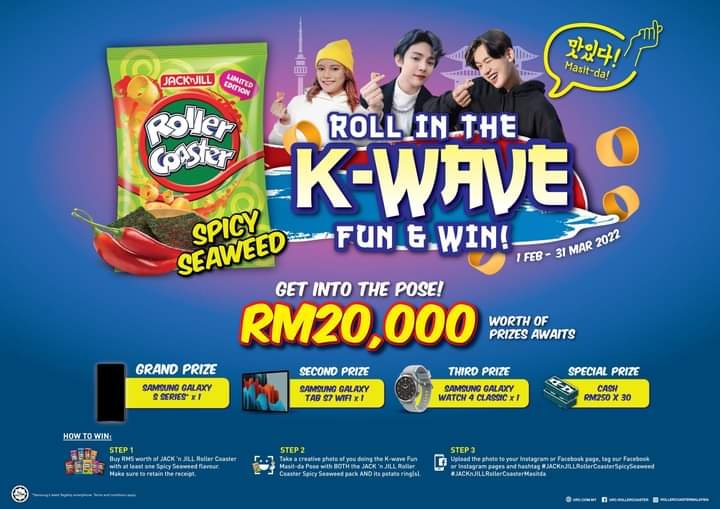 Perisa baharu ini bakal menjadi makanan ringan kegemaran ramai rakyat Malaysia yang sudah biasa dengan hidangan Korea. Untuk menambahkan lagi keseronokan menikmati snek perisa baharu yang enak ini, penggemar makanan ringan ini juga akan berpeluang memenangi hadiah bernilai RM20,000 termasuk Hadiah Utama telefon bimbit Samsung Galaxy S Series apabila mereka menyertai Peraduan JACK ‘n JILL Roller Coaster K-wave Fun & Win. Hadiah lain untuk dimenangi ialah Samsung Galaxy Tab S7 Wi-Fi, Jam tangan Samsung Galaxy 4 Klasik dan 30 RM250 wang tunai.