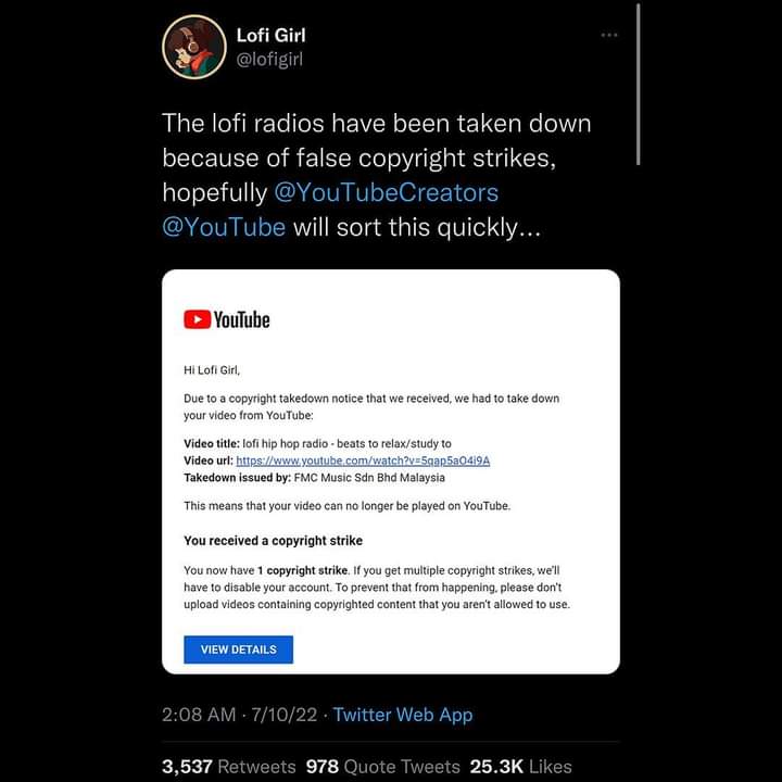 Channel YouTube Lofi Girl melaporkan di Twitter dua video mereka telah diturunkan dari platform YouTube kerana telah menerima ‘copyright strike’. Salah satu video ini yang telah distrim sejak dua tahun lalu menerima lebih 600 juta tontonan. Pihak YouTube bagaimanapun memohon maaf kerana penurunan video ini ialah kesilapan mereka dan memastikan video-video ini akan dinaikkan semula.