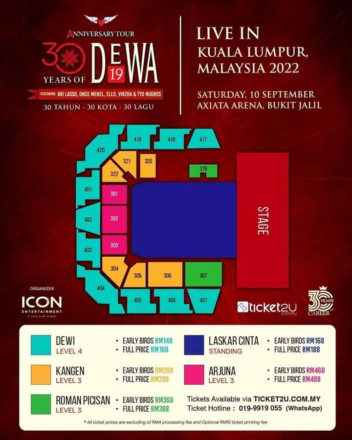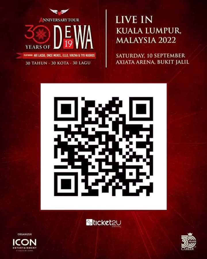 Muktamad! Tarikh dan tempat bakal berlangsungnya konsert Dewa 19 di Kuala Lumpur sempena ulangtahun ke-30 penubuhan akhirnya diumumkan. 30 lagu akan dimainkan. Tiket boleh dibeli mulai 11 pagi esok (rujuk kod QR).