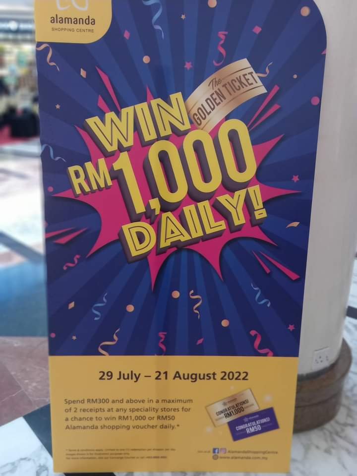 Keriangan di Alamanda diteruskan dengan pelancaran kempen ganjaran harian. Kempen yang akan berlangsung pada hari ini sehingga 21 Ogos 2022 mengundang para pengunjung untuk memenangi cabutan bertuah segera apabila pembelian minimum yang bernilai RM300 melalui dua bukti resit daripada mana-mana kedai terpilih di Alamanda layak menyertai cabutan bertuah segera ini.