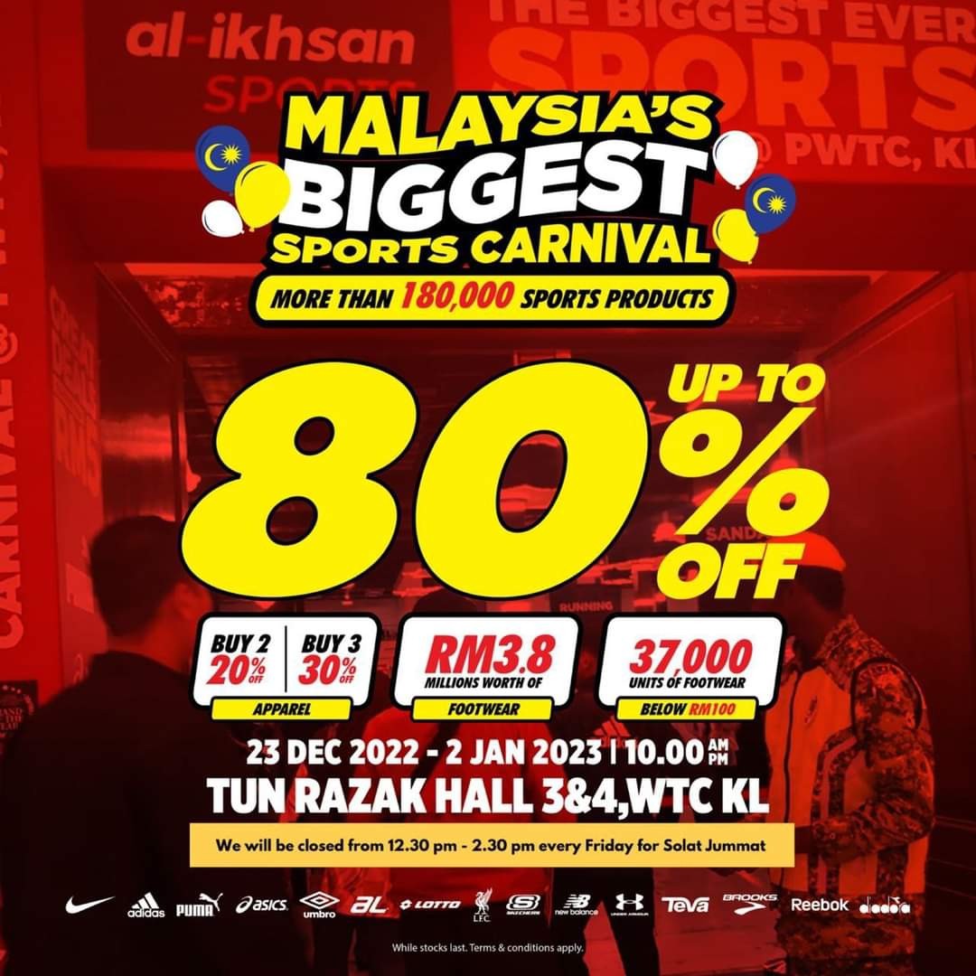 Karnival sukan kali ini memberi peluang kepada semua pelanggan Al-Ikhsan Sports untuk menikmati diskaun sehingga 80% untuk lebih daripada 180,000 barangan sukan yang pastinya akan menggayakan sambutan tahun baru mereka dengan lebih ‘sporty’ dan selesa.