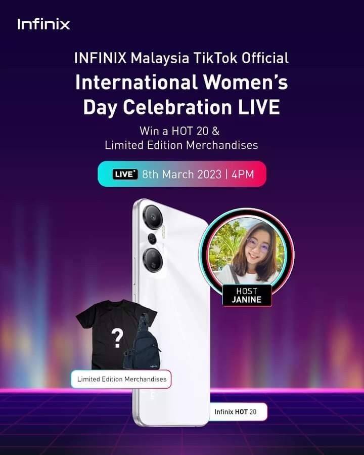In conjunction with the upcoming International Women’s Day, Infinix Malaysia today announced to kickstart their first TikTok livestream, Tune In to Win It with Infinix, by giving away exciting prizes worth more than RM1,000. Malaysians can stand a chance to walk away with the latest HOT 20 smartphone and Infinix’s limited-edition merchandise by following Infinix Malaysia’s official TikTok channel and tuning in to their TikTok livestream on the 8th of March 2023 at 4pm.