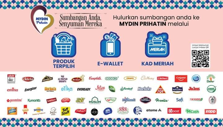 Tidak dilupakan nasib mereka yang kurang bernasib baik, MYDIN menerusi inisiatif MYDIN Prihatin juga turut menjalinkan kerjasama strategik bersama lebih 50 jenama pembekal. Pelanggan yang membeli produk terpilih bagi jenama terlibat, sejumlah dana akan disumbangkan kepada rumah kebajikan berdaftar dengan Jabatan Kebajikan Masyarakat di seluruh negara. Pelanggan juga boleh menyumbang melalui rakan e-dompet terlibat atau dengan memotong mata ganjaran kad Meriah di kaunter bayaran MYDIN.