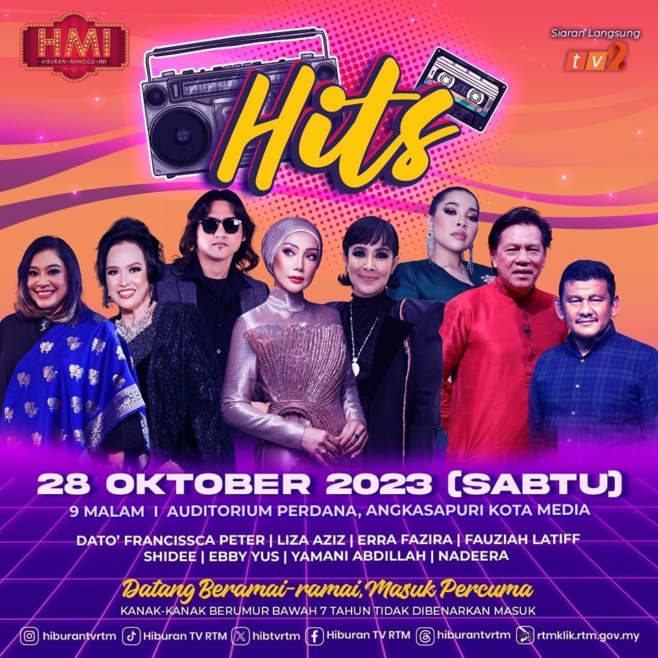 Radio Televisyen Malaysia (RTM) menyatukan lapan artis dalam satu pentas sama bertempat di Auditorium Perdana, Angkasapuri, Kota Media, menerusi program hiburan santai terbitan Unit Hiburan TV RTM iaitu “HMI, Hiburan Minggu Ini: Hits”, yang menemui penonton pada 28 Oktober 2023, Sabtu ini, pukul 9.00 malam.