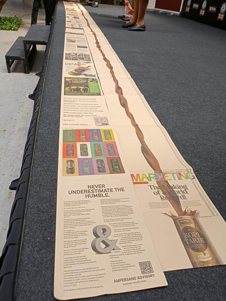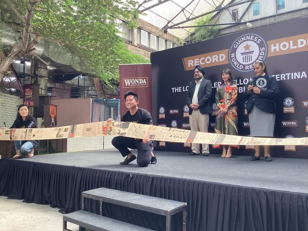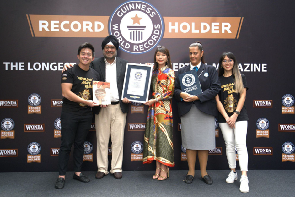 17 November 2023, KUALA LUMPUR – Wonda Coffee, salah satu jenama kopi sedia diminum terkemuka di Malaysia kini memecahkan satu lagi Rekod Dunia Guinness untuk ‘Worlds Longest Magazine’. Dengan kerjasama Marketing Magazine Malaysia, majalah terbitan September edisi khas telah dihasilkan dalam gaya akordion berukuran 751.2cm panjang dari sampul hingga penutup apabila dibuka sepenuhnya.