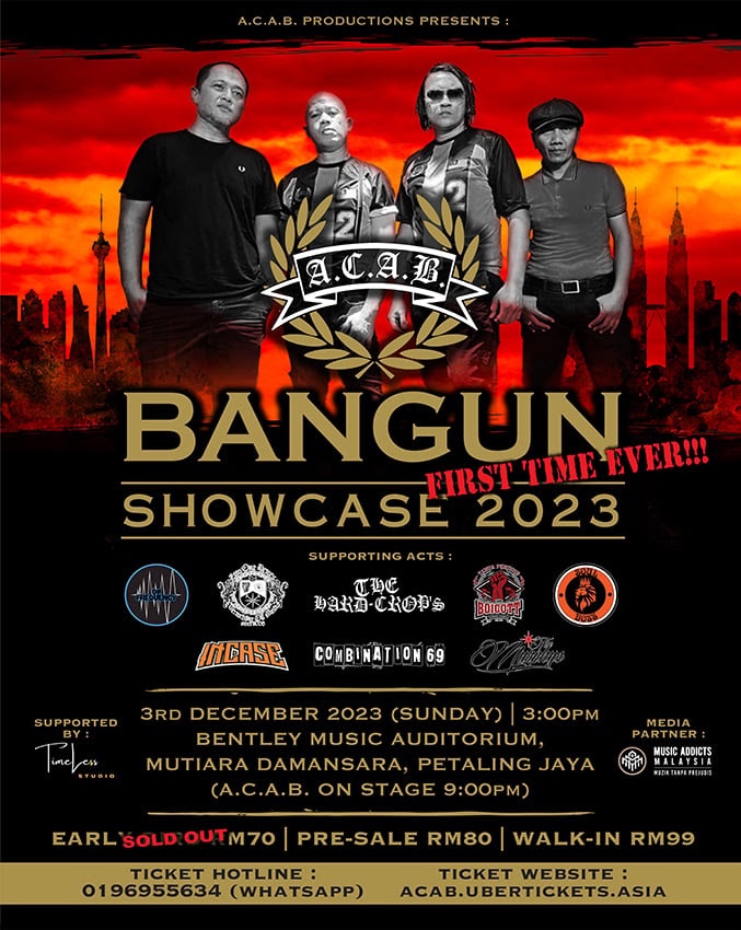 Bangun Showcase 2023 anjuran A.C.A.B Productions ini bakal berlangsung pada 3 Disember 2023, Ahad di Bentley Music Auditorium, Mutiara Damansara, Petaling Jaya mulai jam 3 petang. Turut memeriahkan showcase ini adalah band-band generasi baharu Oi! dan Punk iaitu The Hard Crop’s (Kuala Lumpur), Zero One Heroes (Johor), Incase (Kuala Lumpur), The Murphys (Melaka), Combination 69 (Kuala Lumpur), The Boicott (Perak), Oi! Frequency (Selangor) dan juga set DJ daripada Soul Boss (Kuala Lumpur).