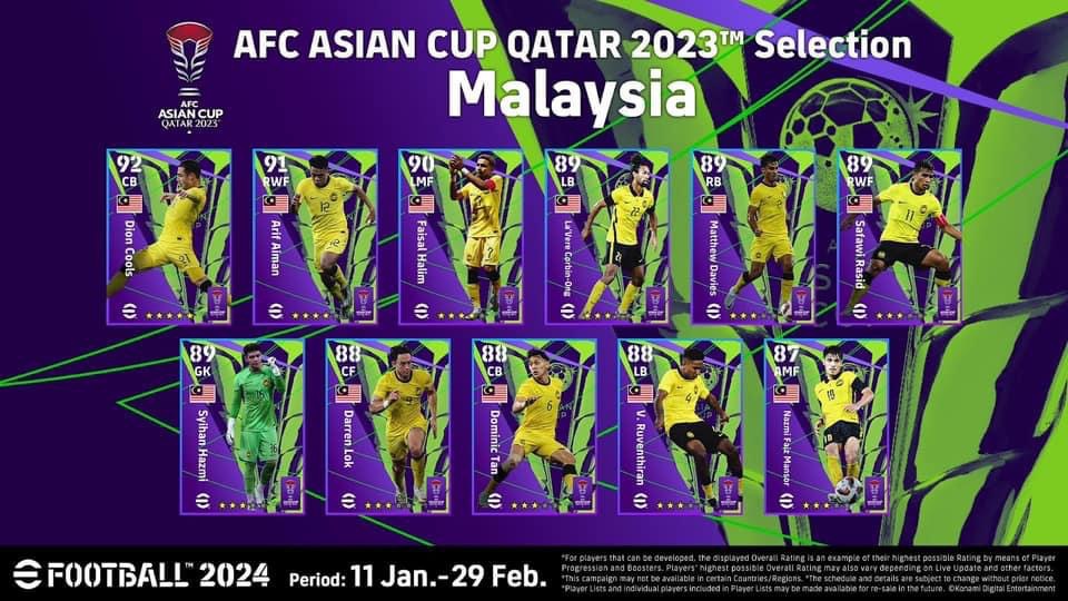 Selaras dengan perkongsian KONAMI dengan Konfederasi Bola Sepak Asia (AFC), integrasi Piala Asia AFC 2023 Qatar, menampilkan Pasukan Kebangsaan Malaysia (Harimau Malaya), kini menjadi kenyataan dalam eFootball™ 2024. Rakyat Malaysia dapat menikmati keseruan bermain Piala Asia AFC dengan hero kebangsaan mereka, memberikan sentuhan autentik kepada pengalaman eFootball mereka.