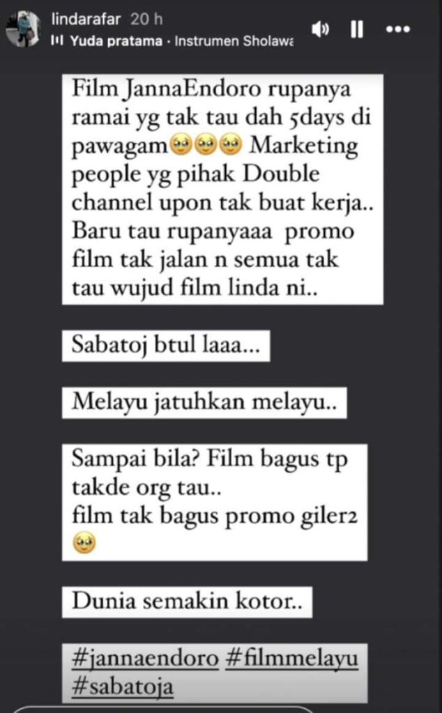 Menurut Linda Rafar, pasukan pemasaran filem gagal menjalankan tugas mereka dengan cekap. “Kami telah mengarahkan pasukan pemasaran untuk mempromosikan filem ini, tetapi mereka tidak melaksanakan tugas dengan sepenuhnya,” katanya dengan nada kecewa.