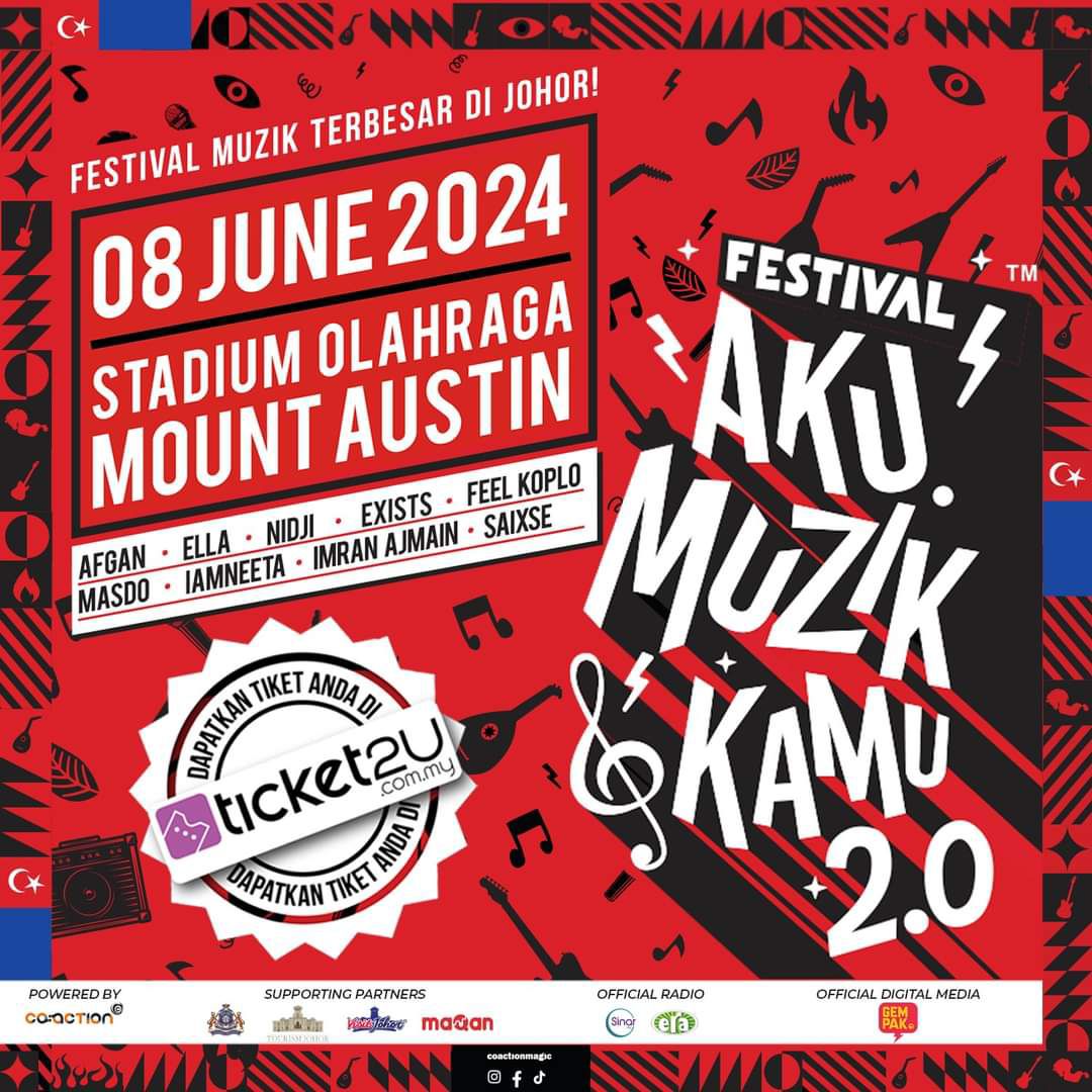 5 Mac 2024 – Festival Aku.Muzik&Kamu (AMK) kini kembali dengan edisi AMK 2.0, menghadirkan barisan artis Nusantara yang bakal menggegarkan dunia muzik. Acara yang dinanti-nantikan ini dijadualkan berlangsung pada 8 Jun 2024 di Stadium Olahraga Mount Austin, Johor Bahru, Johor.
