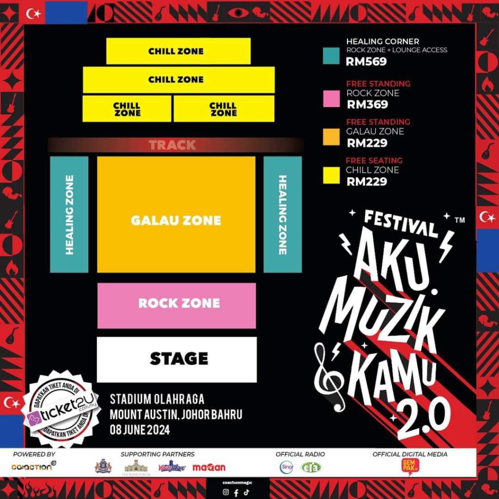 Harga tiket bermula dari RM229 untuk kawasan Chill Zone (Free Seating) hingga RM569 untuk kawasan Rock Zone (Free Standing) dengan akses ke VIP Lounge.