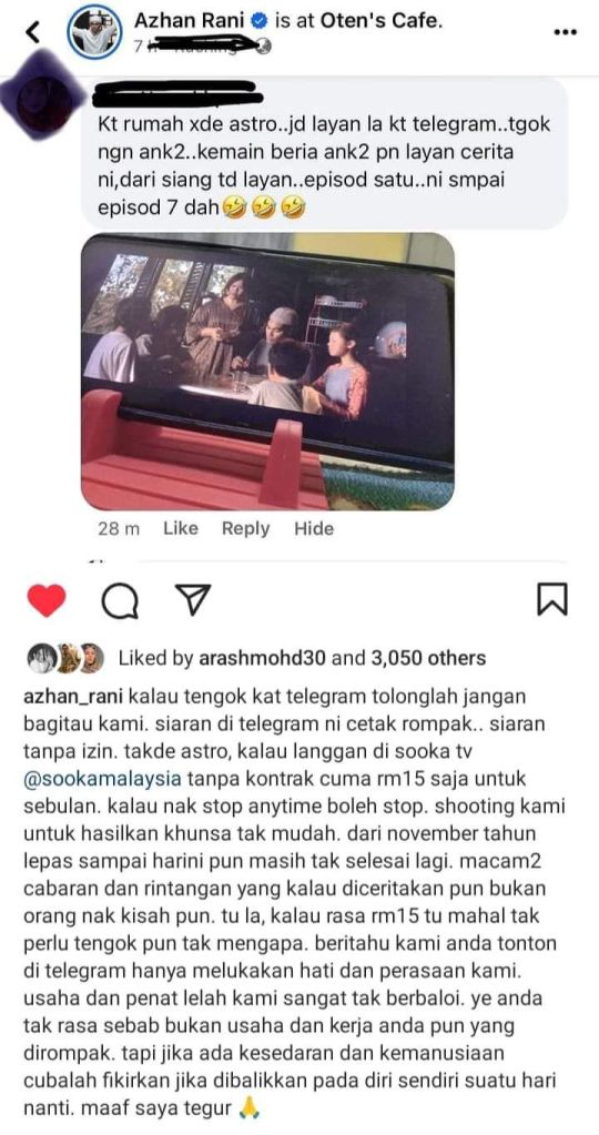 Pelakon Azhan Rani telah menyentuh isu drama bersiri Khunsa, yang kini bersiaran di saluran Astro Ria. Namun, drama ini telah dimuatnaik secara haram melalui aplikasi Telegram. Bagi mereka yang tidak melanggan Astro, terdapat alternatif untuk menonton Khunsa secara halal – iaitu melalui aplikasi Sooka.