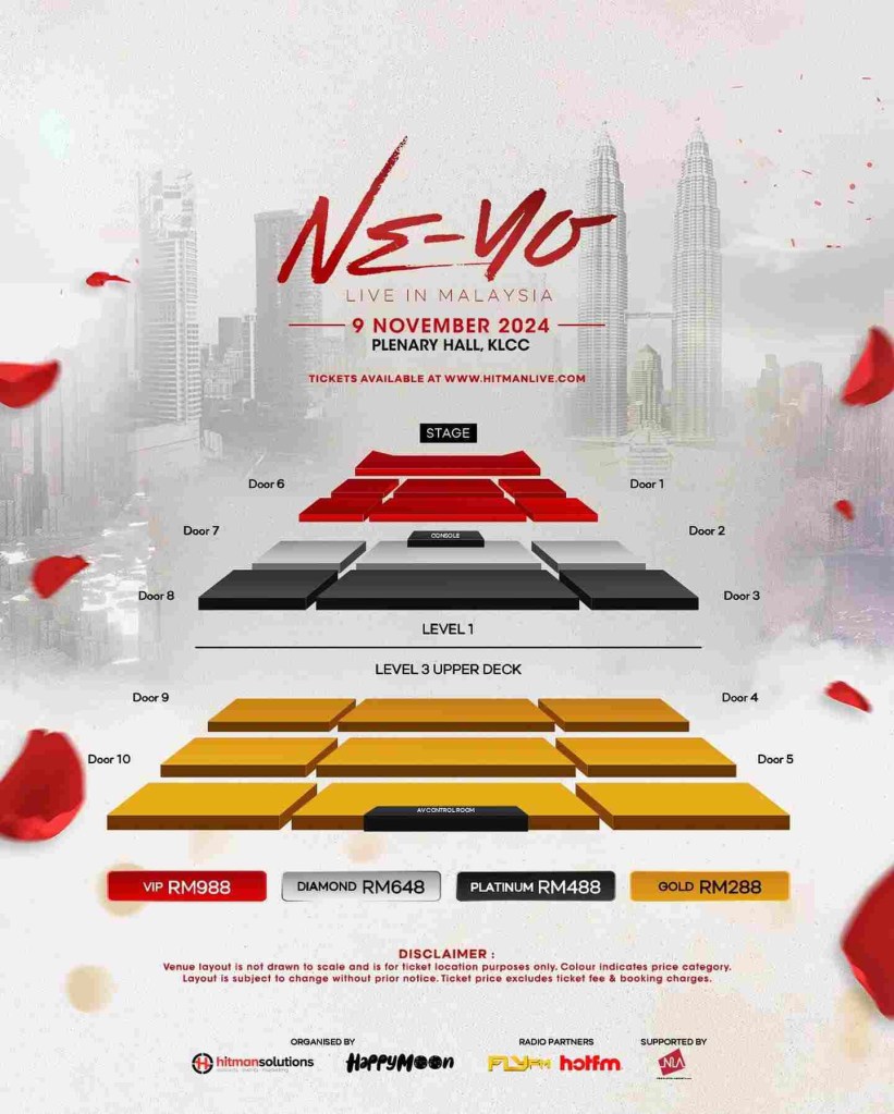 Tiket untuk ‘NE-YO: Live In Malaysia’ 2024 akan mula dijual pada 26 Jun 2024, jam 10 pagi di www.hitmanlive.com dengan kategori tiket VIP (RM988), DIAMOND (RM648), PLATINUM (RM488), dan GOLD (RM288). Untuk maklumat lanjut, sila hubungi 012-2655783.