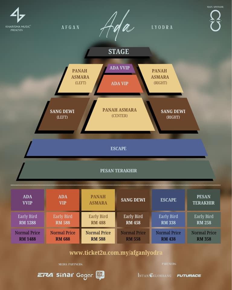 Jualan tiket akan bermula pada 10 Julai 2024 (Rabu), pukul 12:00 tengah hari melalui laman web www.ticket2u.com.my/afganlyodra. Tiket-tiket dijual dalam kategori tempat duduk yang bernombor, dengan pilihan tempat duduk terbaik untuk setiap kategori yang dipilih oleh pembeli.