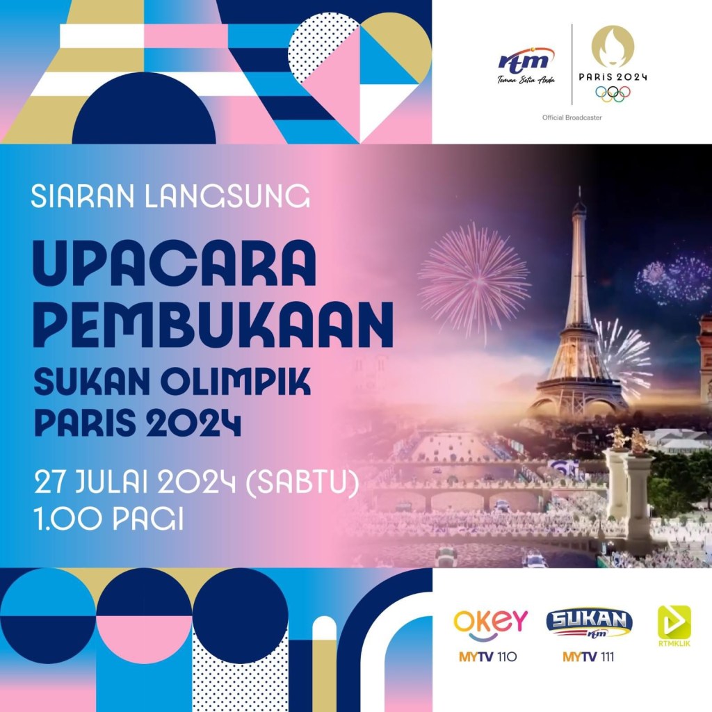 Buat penonton di Malaysia, anda boleh menyaksikan Perasmian Pembukaan Temasya Sukan Olimpik Paris 2024 menerusi RTM pada 27 Julai 2024 jam 1.00 pagi di saluran TV Okey (MyTV 110) dan Sukan RTM (MyTV111). Tonton atas talian di https://rtmklik.rtm.gov.my