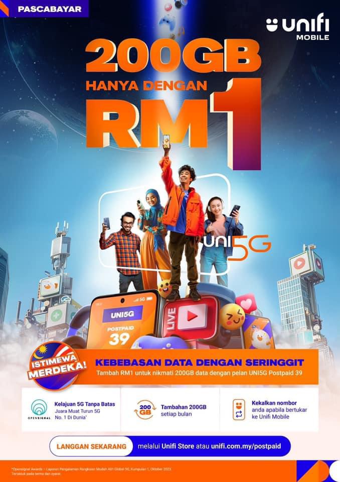 KUALA LUMPUR, 1 OGOS 2024 – Unifi Mobile melancarkan tawaran hebat untuk pelanggan UNI5G Postpaid 39: pas data 5G 200GB sebulan hanya RM1. Tawaran terhad ini memberikan tambahan 200GB data 5G berkelajuan tinggi setiap bulan, meningkatkan pengalaman mudah alih pengguna.