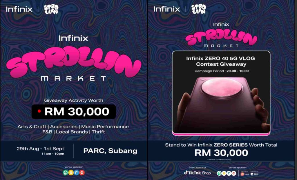 Sempena pelancaran ZERO 40 5G, Infinix akan menganjurkan acara Infinix Strollin Market bersama Strollin Market di PARC@Subang Ria dari 29 Ogos hingga 1 September 2024. Acara ini menawarkan pelbagai gerai tempatan, makanan, seni, kraf, serta persembahan muzik secara langsung.