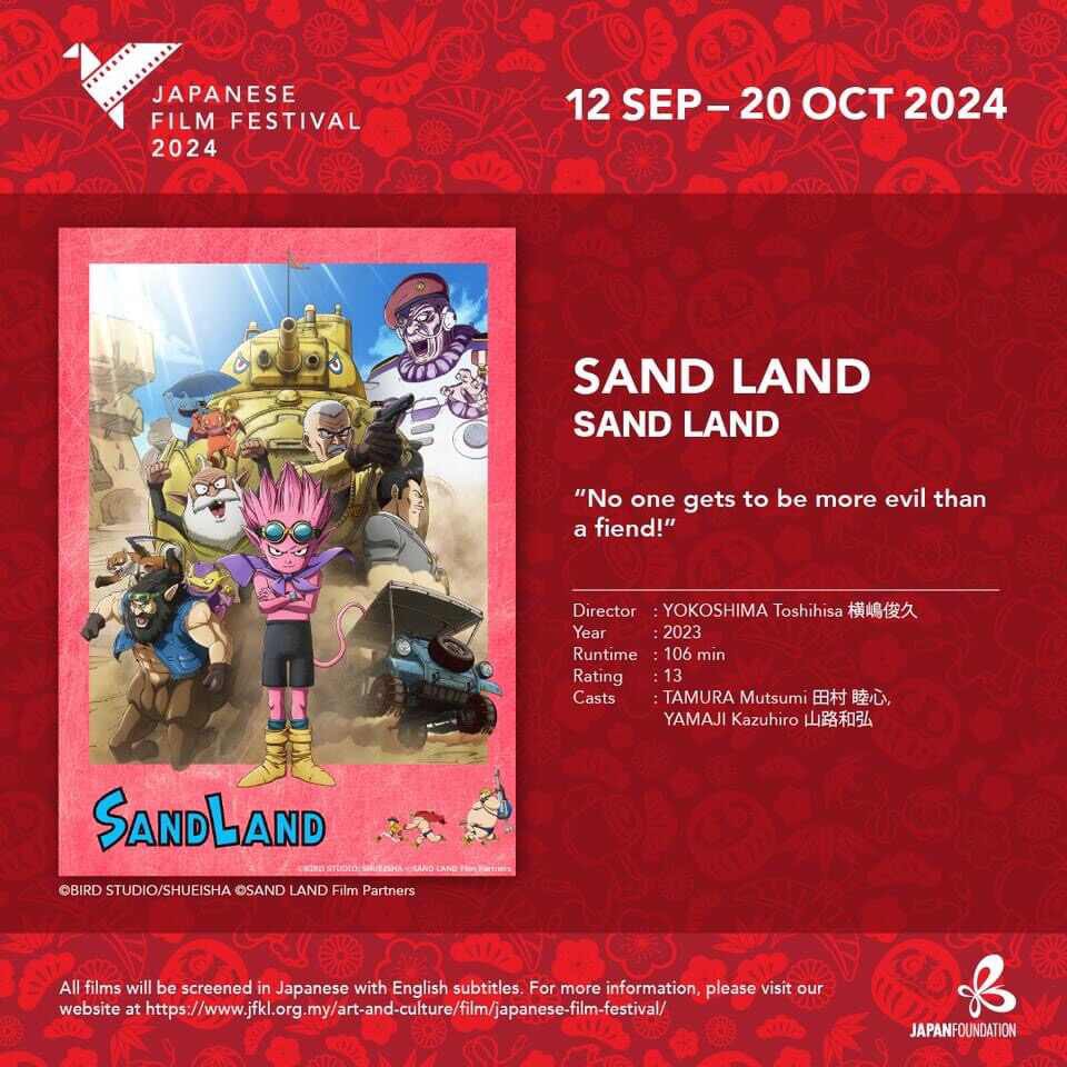 Untuk maklumat lanjut mengenai filem SAND LAND, jadual tayangan, dan butiran festival, lawati laman web JFF2024 di https://www.jfkl.org.my/art-and-culture/film/japanese-film-festival/.