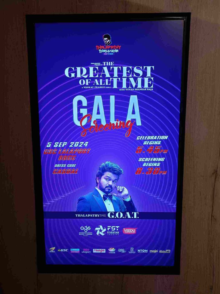 Pada 5 September 2024, tayangan perdana filem The Greatest Of All Time yang dibintangi oleh Thalapathy Vijay dan diarahkan oleh Venkat Prabhu berlangsung meriah di GSC Lalaport BBCC. Diedarkan oleh Five Star Trading (FST) dan Veedu Production, acara ini menonjolkan semangat inklusiviti dengan penyediaan sarikata bahasa Melayu untuk menarik penonton daripada pelbagai budaya di Malaysia. Antara tetamu kehormat yang hadir termasuklah YB Datuk Seri Dr. M. Saravanan, Datuk T. Mohan, dan Dato Sri G. Suasana dimeriahkan lagi dengan aktiviti menarik serta kehadiran peminat yang berpakaian sebagai watak-watak ikonik lakonan Vijay.