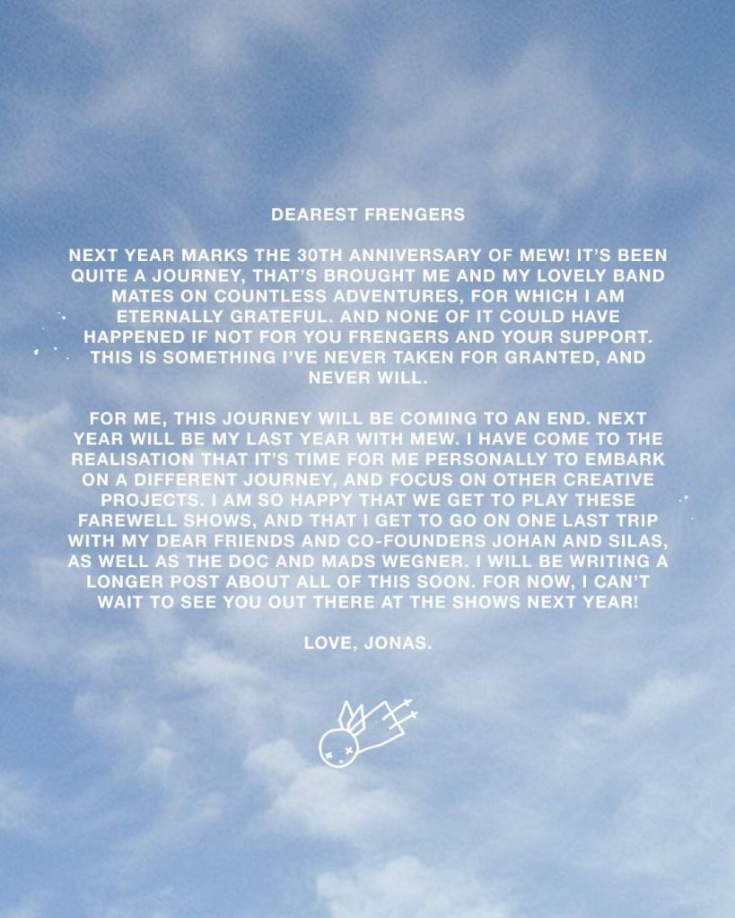 Band indie-prog yang berasal dari Denmark, Mew telah membuat pengumuman mengejutkan yang pastinya mengecewakan ramai peminat mereka. Jonas Bjerre, vokalis utama Mew, mengesahkan bahawa tahun hadapan akan menjadi tahun terakhir beliau bersama band yang diasaskannya hampir 30 tahun lalu.