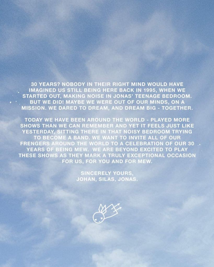 Pengumuman tersebut juga menyentuh tentang bagaimana Mew bermula pada tahun 1995, ketika mereka bermain muzik di bilik Jonas sewaktu remaja. Kini, selepas 30 tahun, mereka telah menjelajah dunia, mengadakan ratusan konsert, dan mencipta kenangan indah bersama peminat setia mereka.
