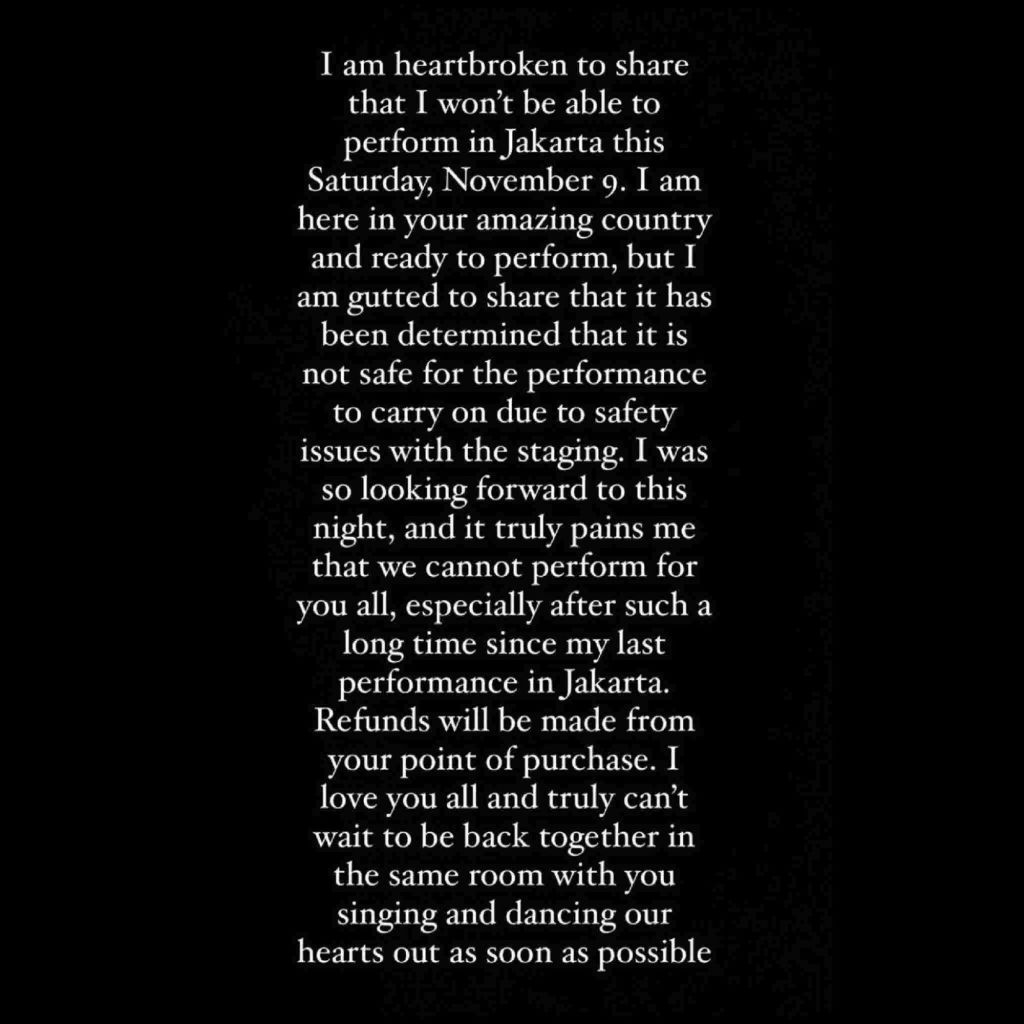 Tambahnya lagi, dia amat menantikan persembahan di Jakarta selepas sekian lama tidak beraksi di negara itu. “I was so looking forward to this night, and it truly pains me that we cannot perform for you all, especially after such a long time since my last performance in Jakarta.”