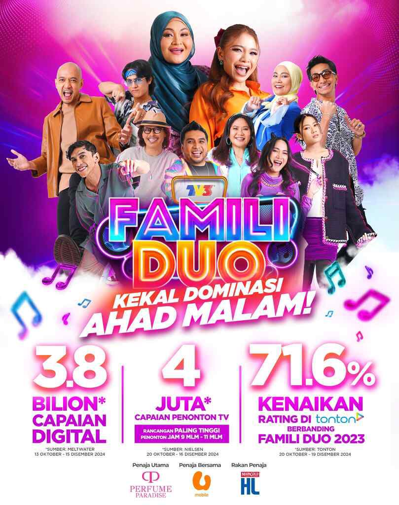 Petaling Jaya, 21 Disember 2024 – Program realiti nyanyian keluarga, Famili Duo Musim 4, mencatat kejayaan besar apabila mencapai tontonan 4.3 juta penonton (sumber: AC Nielsen), menjadikannya rancangan slot Ahad paling popular di TV3. Program ini turut mencatat lonjakan 71.6% dalam rating TV dan platform digital Tonton, membuktikan daya tarikannya dalam kalangan penonton tradisional dan digital.