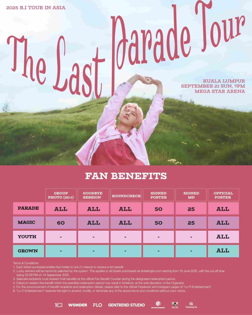 KUALA LUMPUR, 9 Jun 2025 – Penyanyi solo sensasi K-pop, B.I akan kembali menyapa para peminatnya di Malaysia menerusi konsert jelajah terbaharunya bertajuk 2025 B.I TOUR: The Last Parade Tour in KUALA LUMPUR, yang dijadualkan berlangsung pada 21 September 2025 (Ahad), jam 7 malam di Mega Star Arena, Kuala Lumpur.