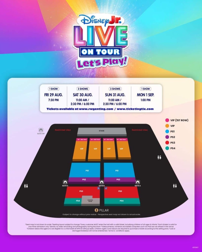 Tiket akan mula dijual pada Rabu, 11 Jun 2025 bermula jam 12 tengah hari. Orang ramai boleh mendapatkan tiket menerusi laman web rasmi rwgenting.com dan ticketingtix.com. Untuk perkembangan terkini, ikuti saluran media sosial rasmi serta tanda pagar #DisneyJrTour di Instagram, Facebook dan TikTok.