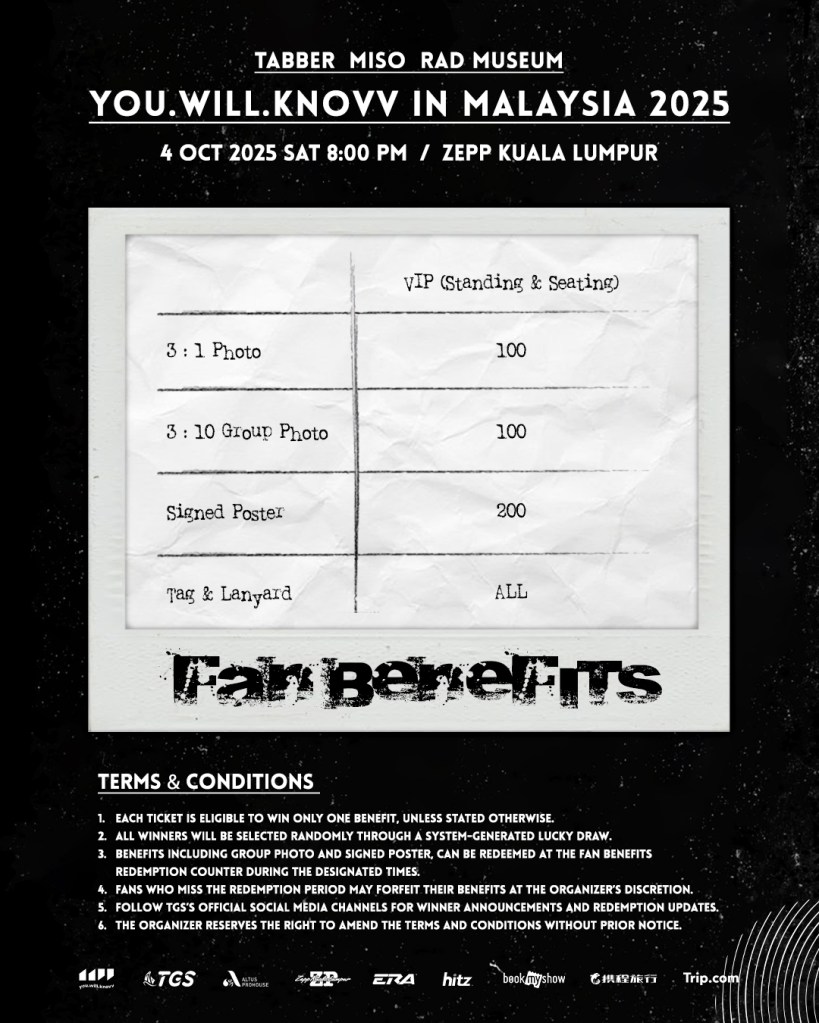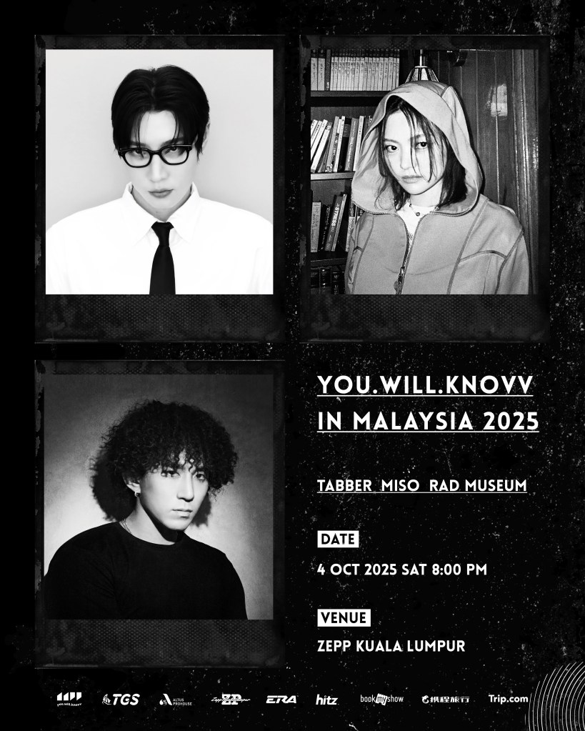 Menampilkan Tabber, Rad Museum dan Miso, you.will.knovv in Malaysia 2025 akan berlangsung di Zepp Kuala Lumpur pada 4 Oktober 2025 (Sabtu), jam 8 malam. Konsert ini dianjurkan oleh TopGallant Show.
