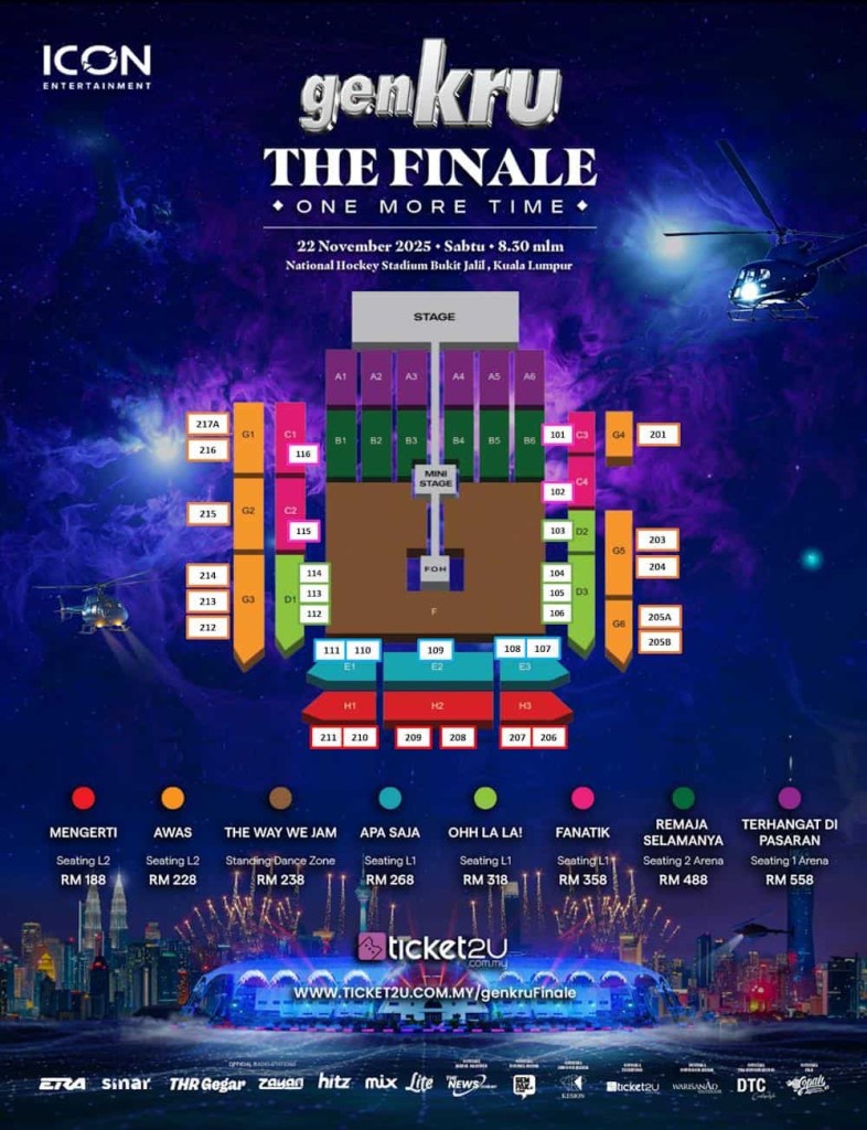 Tiket konsert boleh diperoleh melalui www.ticket2u.com.my/genkruFinale, dengan jualan umum dibuka pada 3 Oktober 2025 bermula jam 11.00 pagi. Stadium Hoki Nasional Bukit Jalil bakal menjadi saksi kepada satu lagi malam bersejarah dalam legasi muzik KRU.