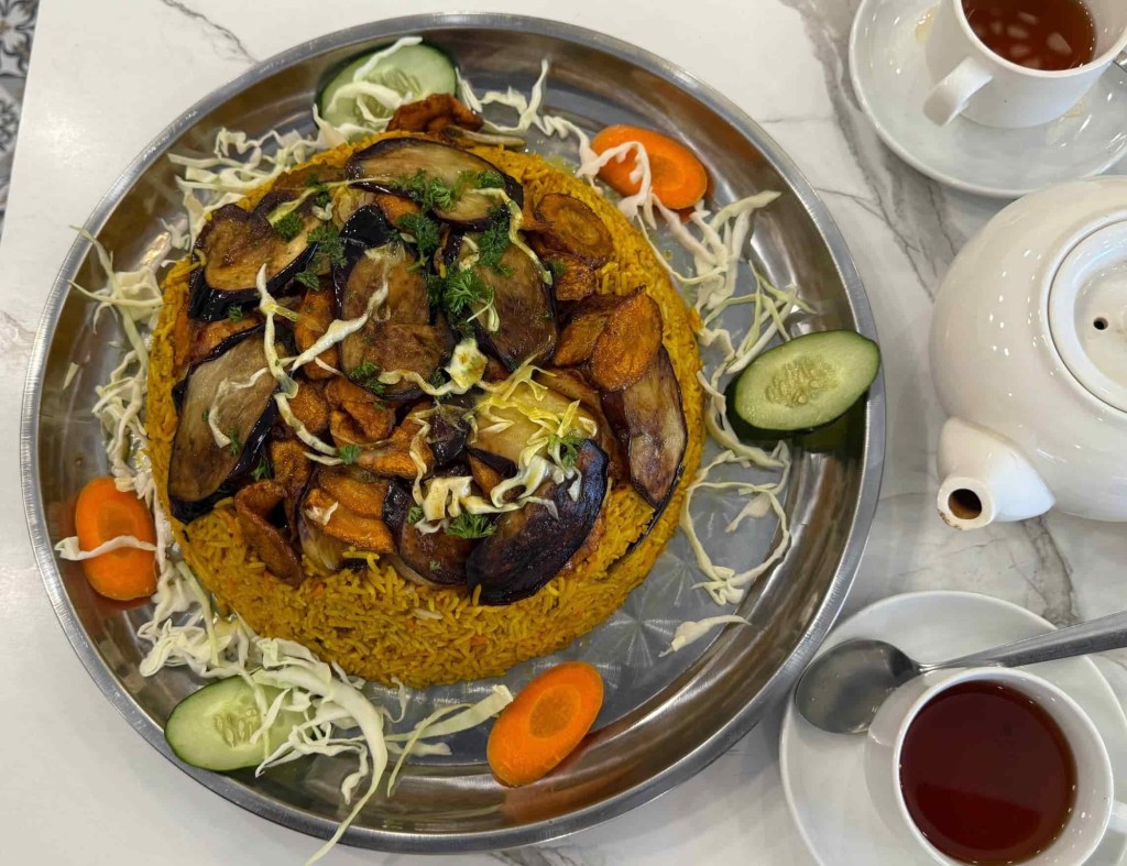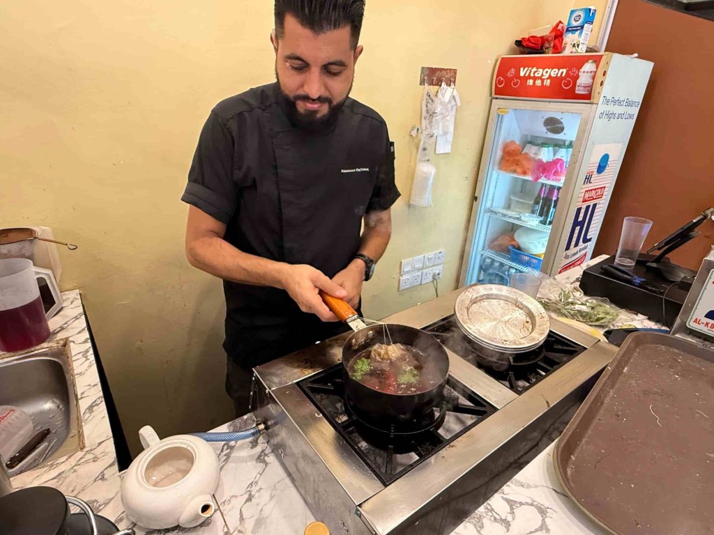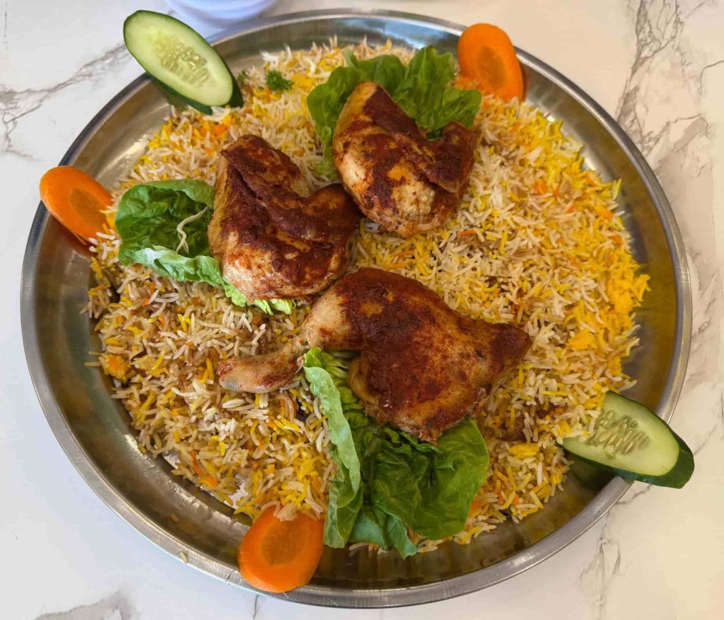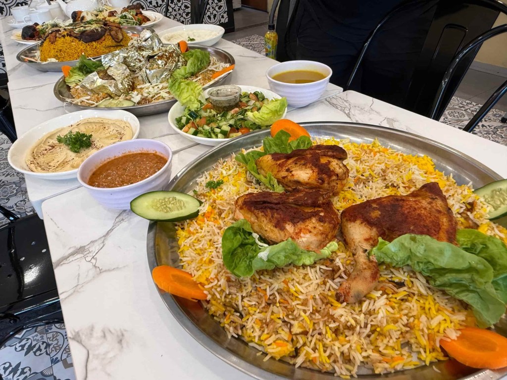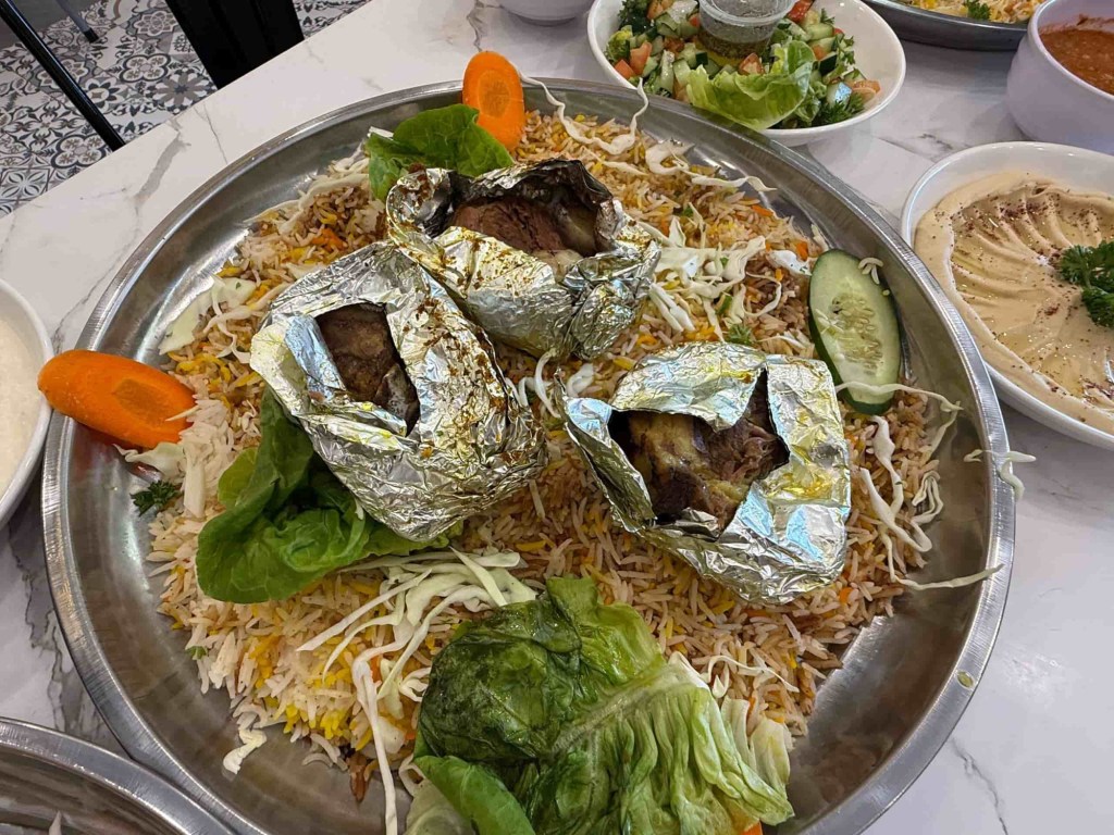Ketika kunjungan kami, Chef Jamal menyambut dengan senyuman dan layanan penuh mesra. Kami dihidangkan tiga jenis nasi utama — Maqlouba, Mandy dan Kabsah – masing-masing menonjolkan keunikan rasa tersendiri. Maqlouba, yang bermaksud “terbalik” dalam bahasa Arab, merupakan hidangan nasi berempah yang disusun berlapis bersama terung dan daging, sebelum diterbalikkan ke dalam pinggan hidangan. Persembahannya memukau, sementara aromanya segera membangkitkan selera.
